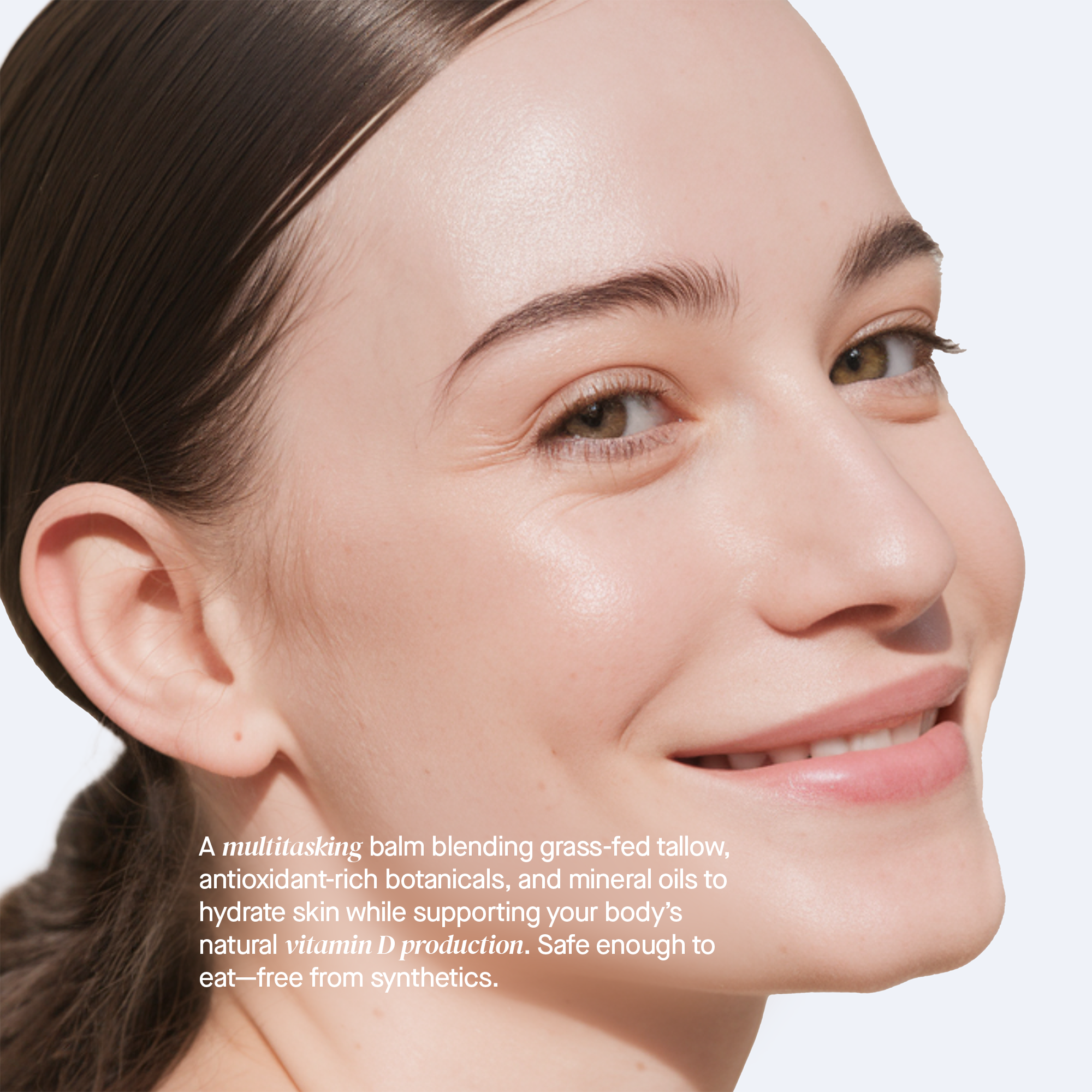 A nourishing balm stick designed to comfort and hydrate skin before and after sun exposure. Crafted with organic grass‑fed beef tallow, antioxidant‑rich raspberry seed oil, non‑nano zinc oxide for a calming barrier, soothing papaya seed oil, and refreshing spearmint oil, this stick moisturizes and comforts your skin. Ideal for all skin types, it’s easy to apply and free of synthetic additives.